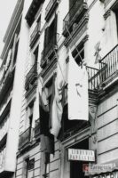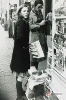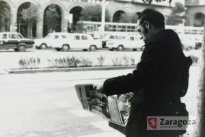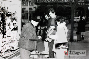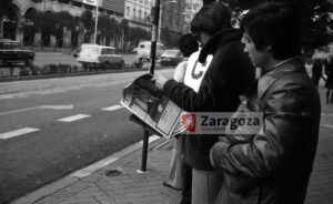 Modesto quiosco de prensa situado en el lateral del Coso del Banco de España. Resulta anecdótico que el joven de la derecha lleva doblado bajo el brazo un ejemplar de Heraldo cuya primera página reza todavía: «Se acentúa el estado crítico del Jefe del Estado». Gerardo Sancho Ramo. 20/11/1975. AMZ_4-1_0025785