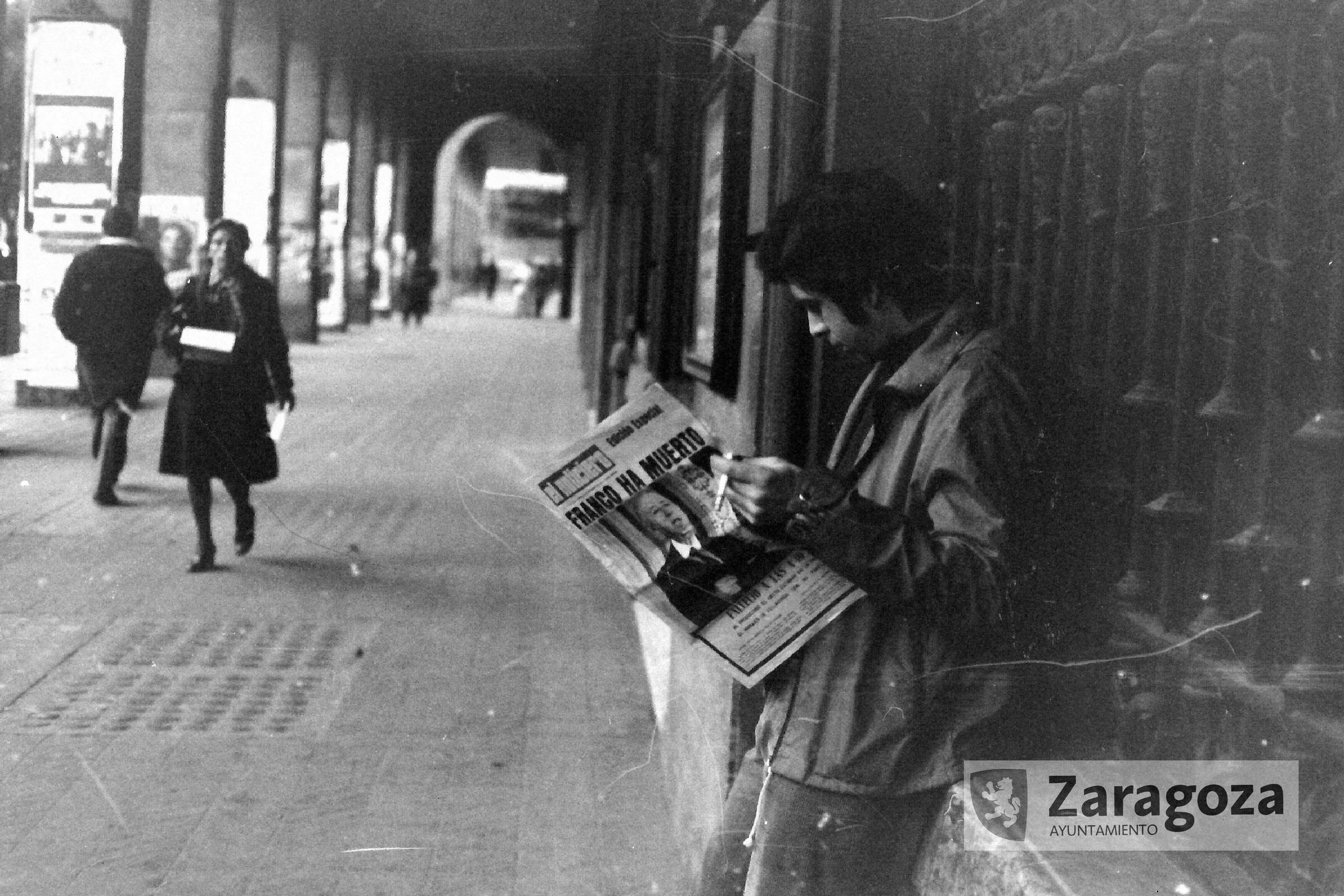 Apoyándose en las rejas del que todavía era banco Hispano Americano, en el 2 de Independencia, un joven tiene abierto el ejemplar de El Noticiero en cuya portada se anuncia la muerte del dictador. Gerardo Sancho Ramo. 20/11/1975. AMZ_4-1_0079773