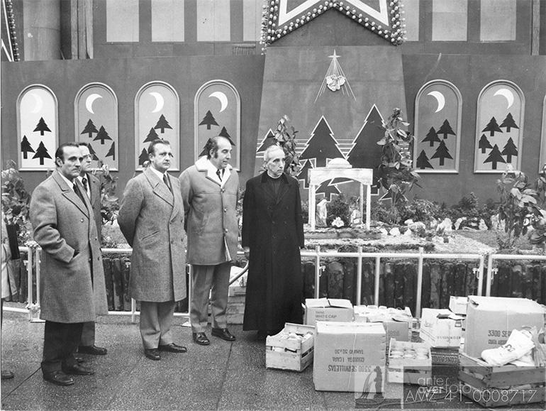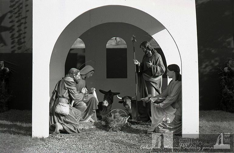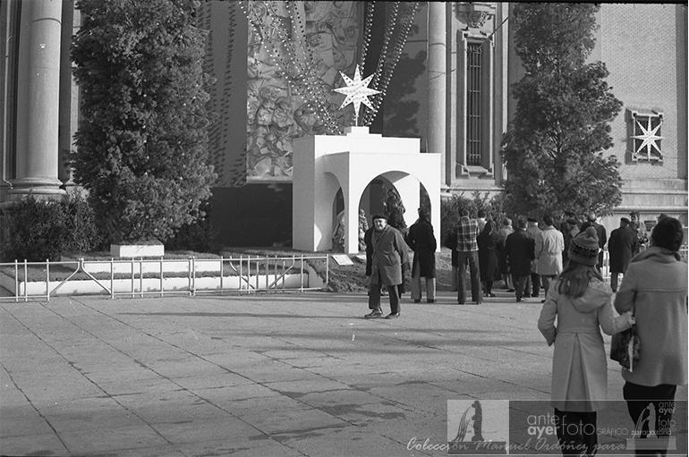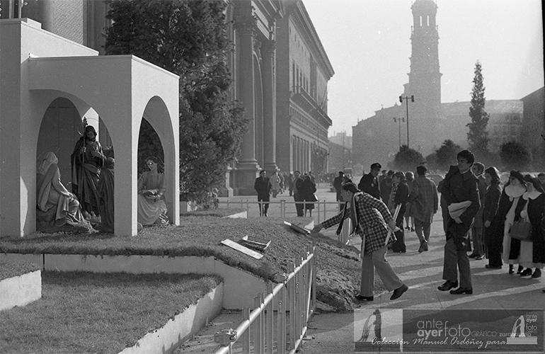 Y llegamos a las navidades de 1973, que trajeron más novedades en lo que al Belén se refiere. Ese año se estrenaban las figuras que vemos en las fotografías de Lee Weatherly, que sustituyeron a las que habían ido de peregrinación en navidades anteriores por el paseo de la Independencia, plaza de España y la propia plaza del Pilar. Se pasó de figuras de un tamaño reducido a otras de tamaño natural, que son las que aún podemos ver hoy en día, salvo la del niño, que una noche desapareció a manos de un grupo de “curas obreros” como una forma de protesta. Tras la sustracción iban cantando un villancico por las calles del centro que decía que el niño Jesús no aparecería hasta que estos trabajadores no pudieran comer. La figura del Niño nunca volvió a su cuna, cada uno puede sacar sus propias conclusiones.