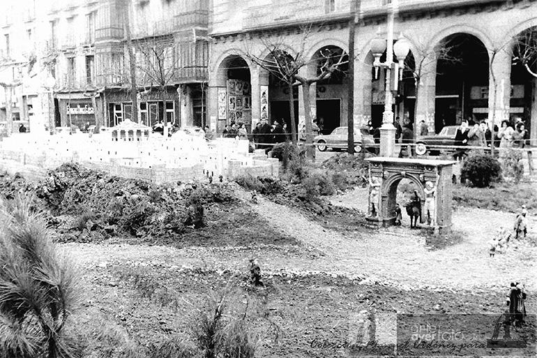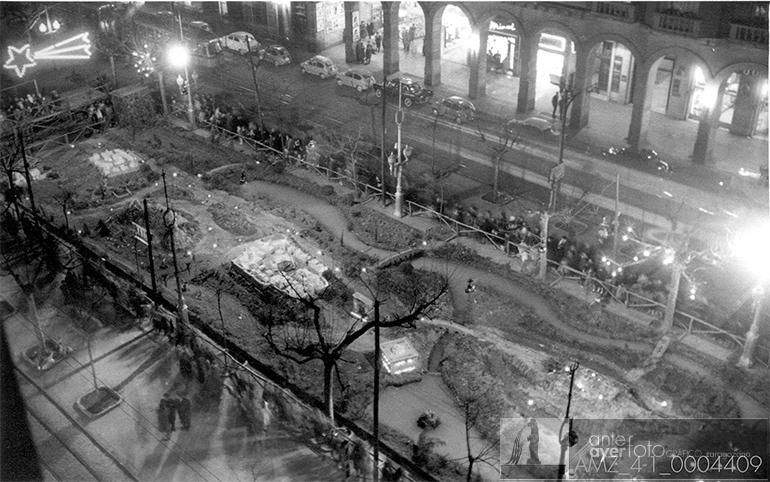 Paseo de la Independencia. Belén municipal en el que aparece una recreación de la portada del Palacio de los Condes de Morata flanqueada por los gigantes Hércules y Gerión. Al fondo, el Cine Coliseo. Gerardo Sancho, 1960.