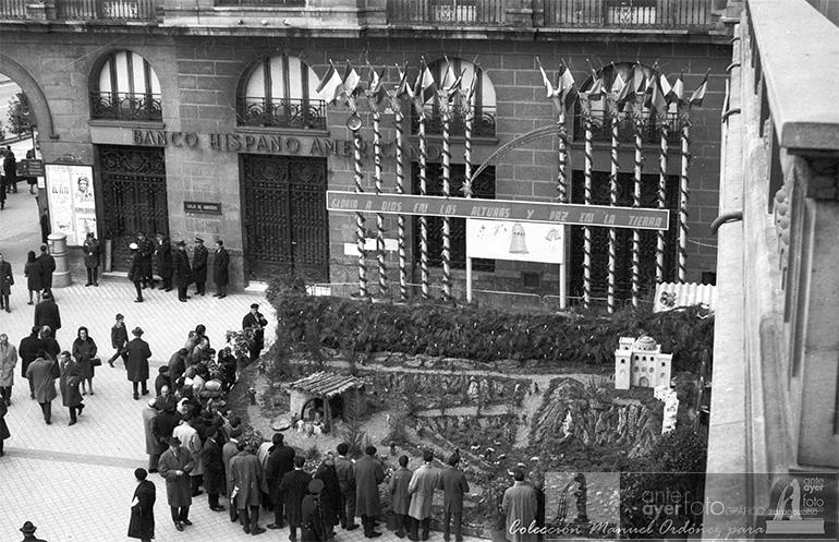 Plaza de España. Fotografía tomada desde uno de los balcones de la Diputación Provincial. El Banco Hispano Americano y los porches del paseo de la Independencia sirven de fondo al Belén instalado en esa ubicación hasta 1970.