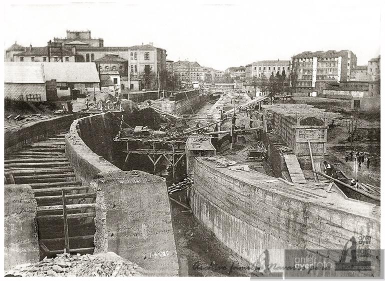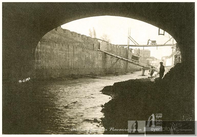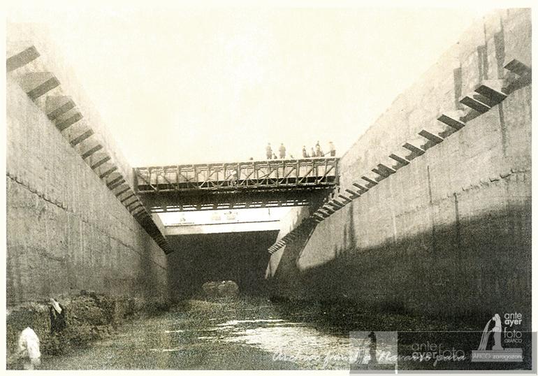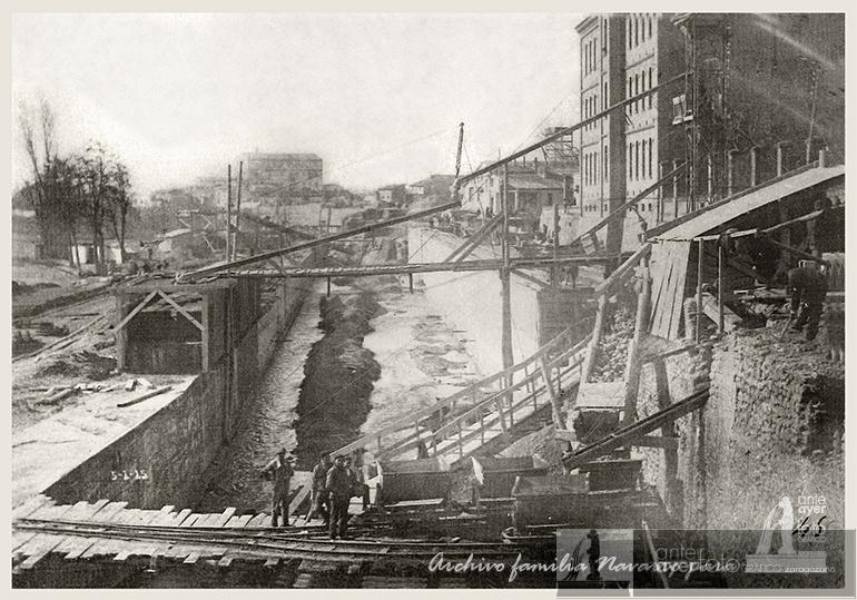 Río Huerva desde el puente de Santa Engracia. Entramado de tablones y maquinaria para el cubrimiento del río. A la derecha el Hospital Universitario, seguido de La Veneciana y al fondo la fábrica de sombreros de Gregorio Hernández.