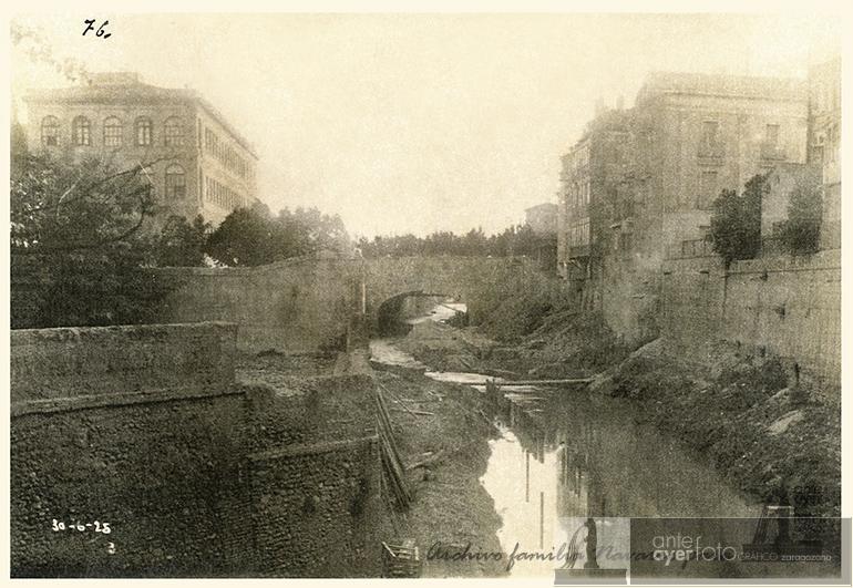 Río Huerva aguas abajo del puente de Santa Engracia, que aparece al fondo. A la izquierda, el edificio del Colegio del Salvador de los Jesuitas y a la derecha se ven las traseras de los hotelitos de la Plaza de Aragón, con parte del edificio de la Facultad de Medicina y Ciencias que sobresale al fondo. Archivo familia Navarro. 30-06-1925