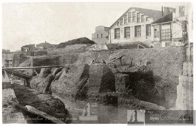 Traseras de la fábrica de don Basilio Paraiso, "La Veneciana", que asoman sobre el desnivel en el que se realizan los trabajos de encauzamiento del río antes de su cubrimiento.