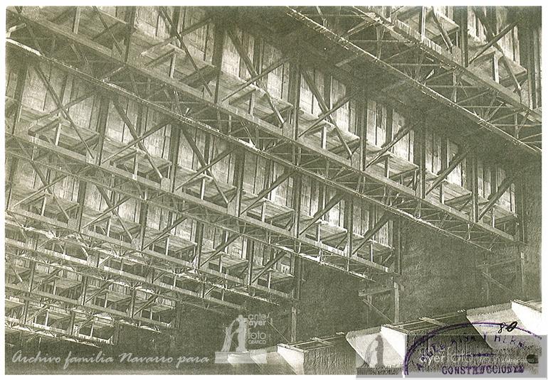 Entramado de las vigas que componían la cubierta del cubrimiento del río hasta su desmontaje en 2009. Archivo familia Navarro. 1925