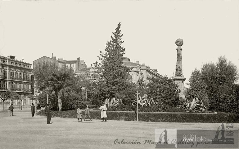Plaza de Aragón, con el Monumento al Justiciazgo en el centro de la misma, rodeado de la exuberante vegetación que completaba el óvalo de la plaza, con alguno de los desaparecidos hotelitos, ca. 1915. Fototipia Thomas. Colección Manuel Ordóñez
