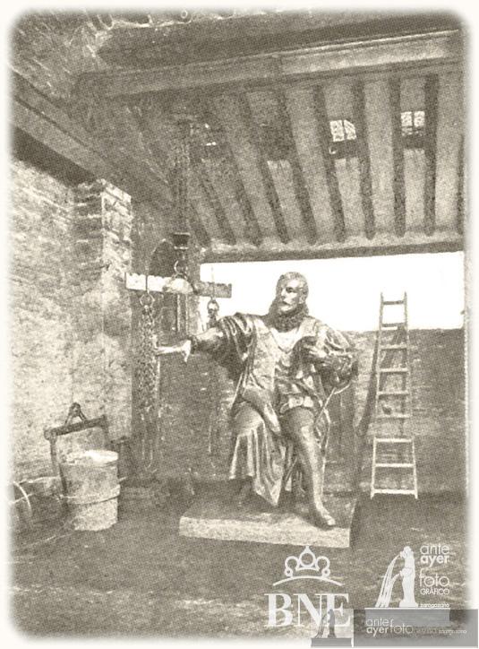 La estatua de bronce realizada en los talleres de Antonio Averly, colocada en sus instalaciones junto a la zona donde fue fundida, y donde se pudo visitar hasta su traslado a la Diputación Provincial de Zaragoza.