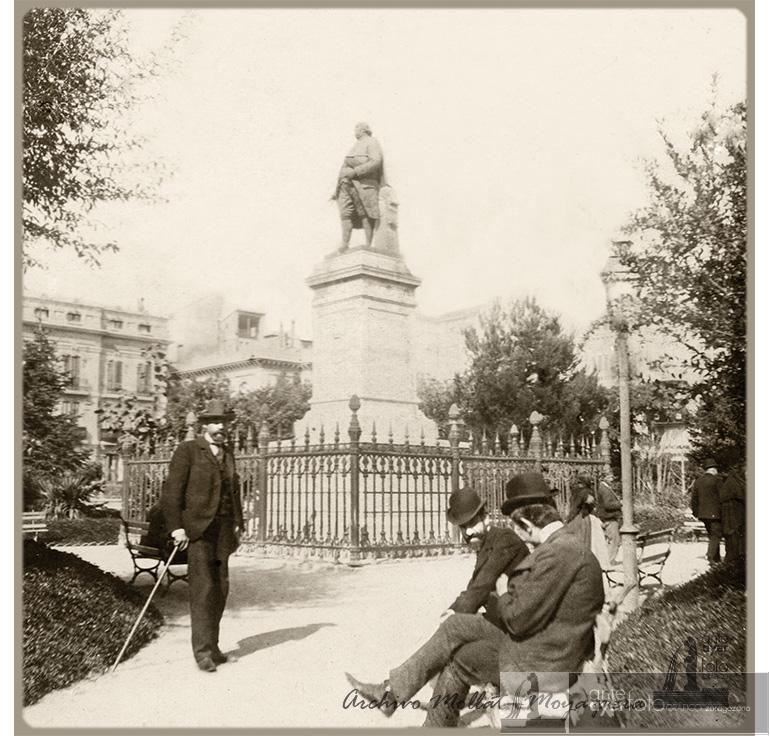 Monumento a don Ramón de Pignatelli, obra de Antonio Palao, que permaneció en la Glorieta de su mismo nombre desde 1859 hasta 1904, cuando fue trasladada a Torrero, cediendo su lugar al Monumento al Justiciazgo. Octubre de 1903.