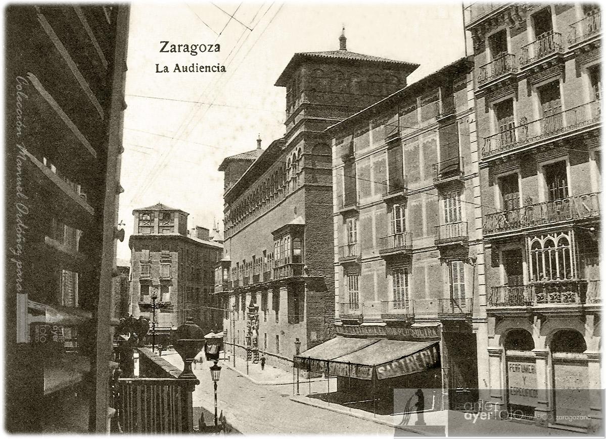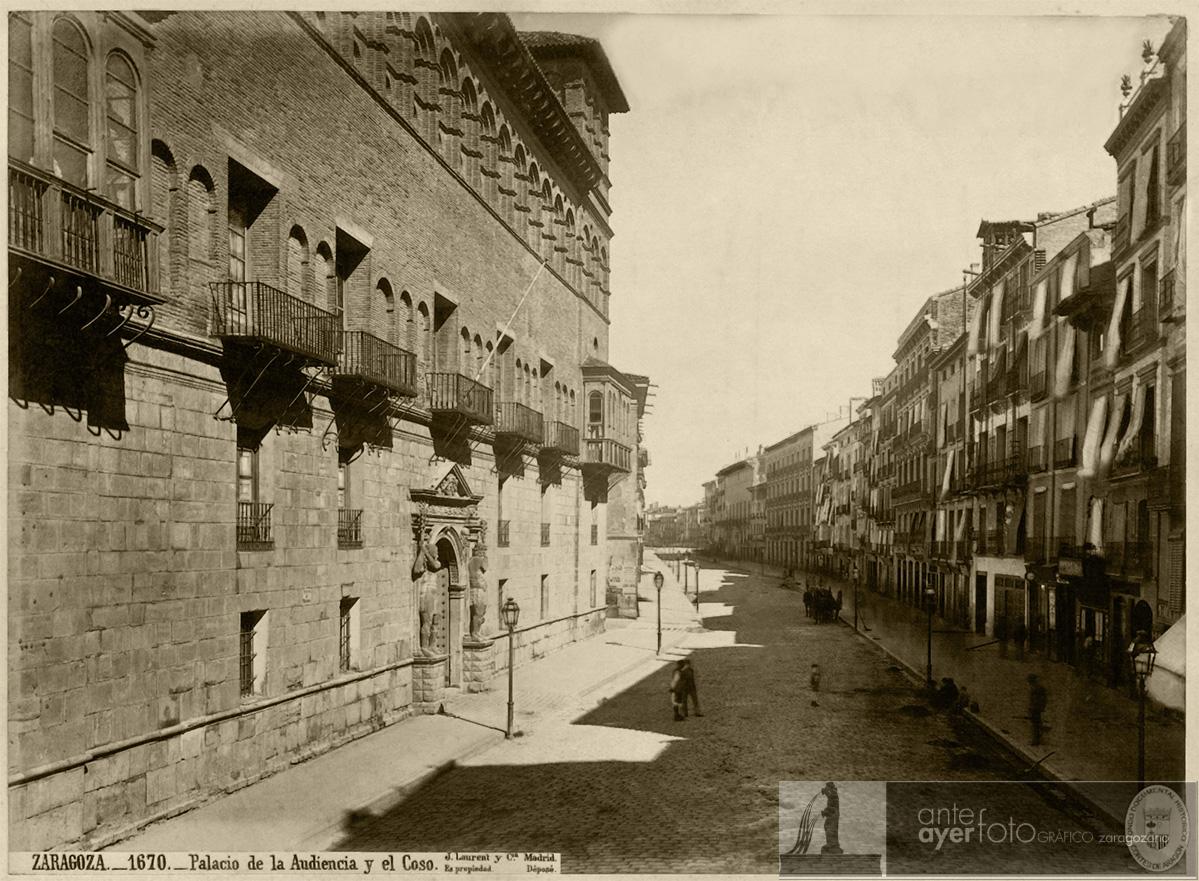 Vista del Coso, con la Audiencia, la sastrería “El Non Plus Ultra” en el número 3 y el establecimiento de José Alfonso en el número 5. Al fondo, la Casa de las Monas flanqueada por la calle de Cerdán a su derecha y la de Escuelas Pías a su izquierda.