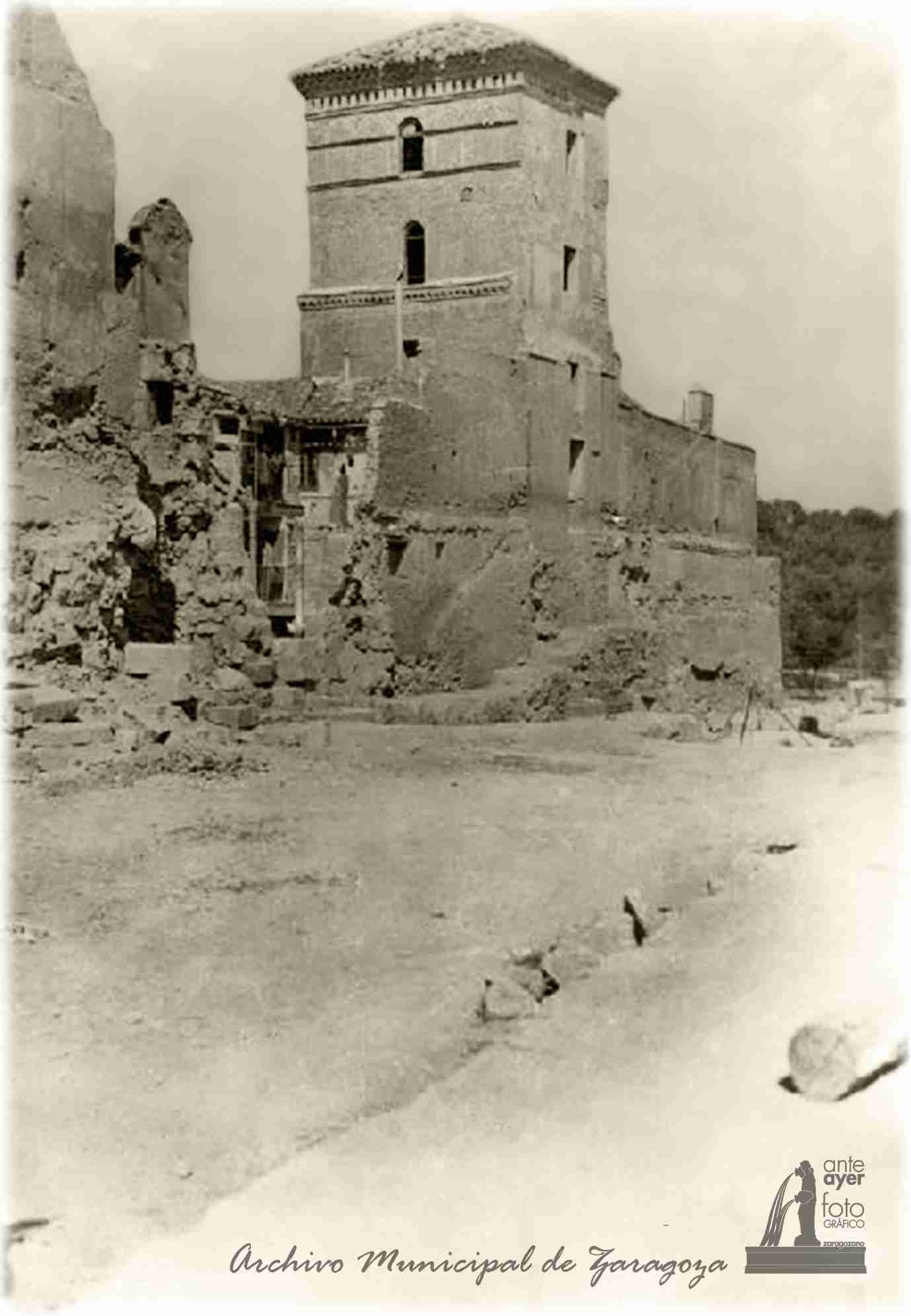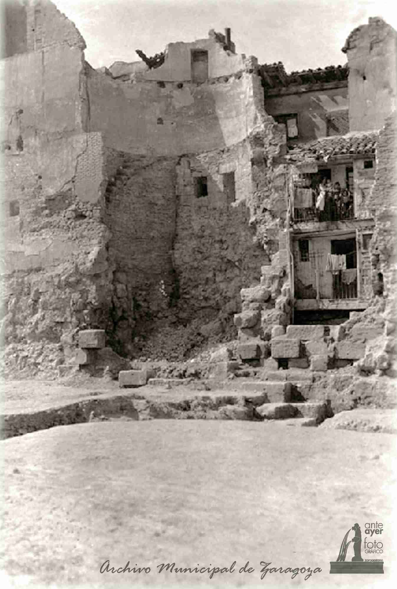 Si para el pueblo llano era aquella una barriada humilde, la intelectualidad conocía su importancia histórica. A principios de 1929 el alcalde Luis Allué prometía recuperar alguna de las antiguas salas del palacio y celebrar en ellas cada enero la reconquista. Por contra su sucesor, Jorge Jordana, calificó todo aquello como “ruinas” que eliminar en pos de modernos planteamientos. Es curioso el que en julio de 1930 las actas municipales mencionen la construcción de un edificio en los corrales del nº 1 de la plaza de Huesca. La finca, destinada a garaje, era propiedad de Melchor Buil, titular de la línea de autobuses de Garrapinillos. Alegaba Buil que sus cocheras eran compatibles con la futura “estación de autobuses”, uno de los muchos proyectos asignables a la zona. La inconcreción no fue óbice para que en 1931, sin haber llegado a un acuerdo sobre qué hacer con el torreón y la iglesia, se iniciasen las demoliciones del convento y sus aledaños.