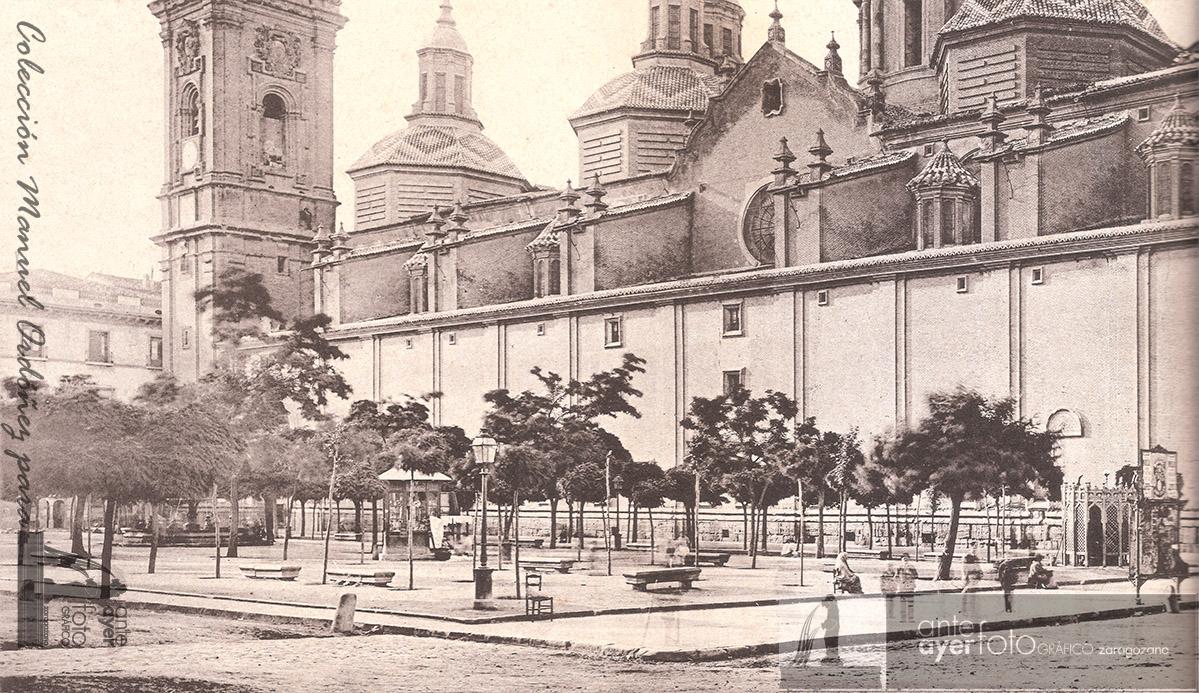 Fachada de la iglesia de Nuestra Señora del Pilar (fragmento). A la izquierda se ve parte de la fuente ornamental que presidió el centro de la plaza hasta 1890. M. Junghändel & C. Gurlitt.