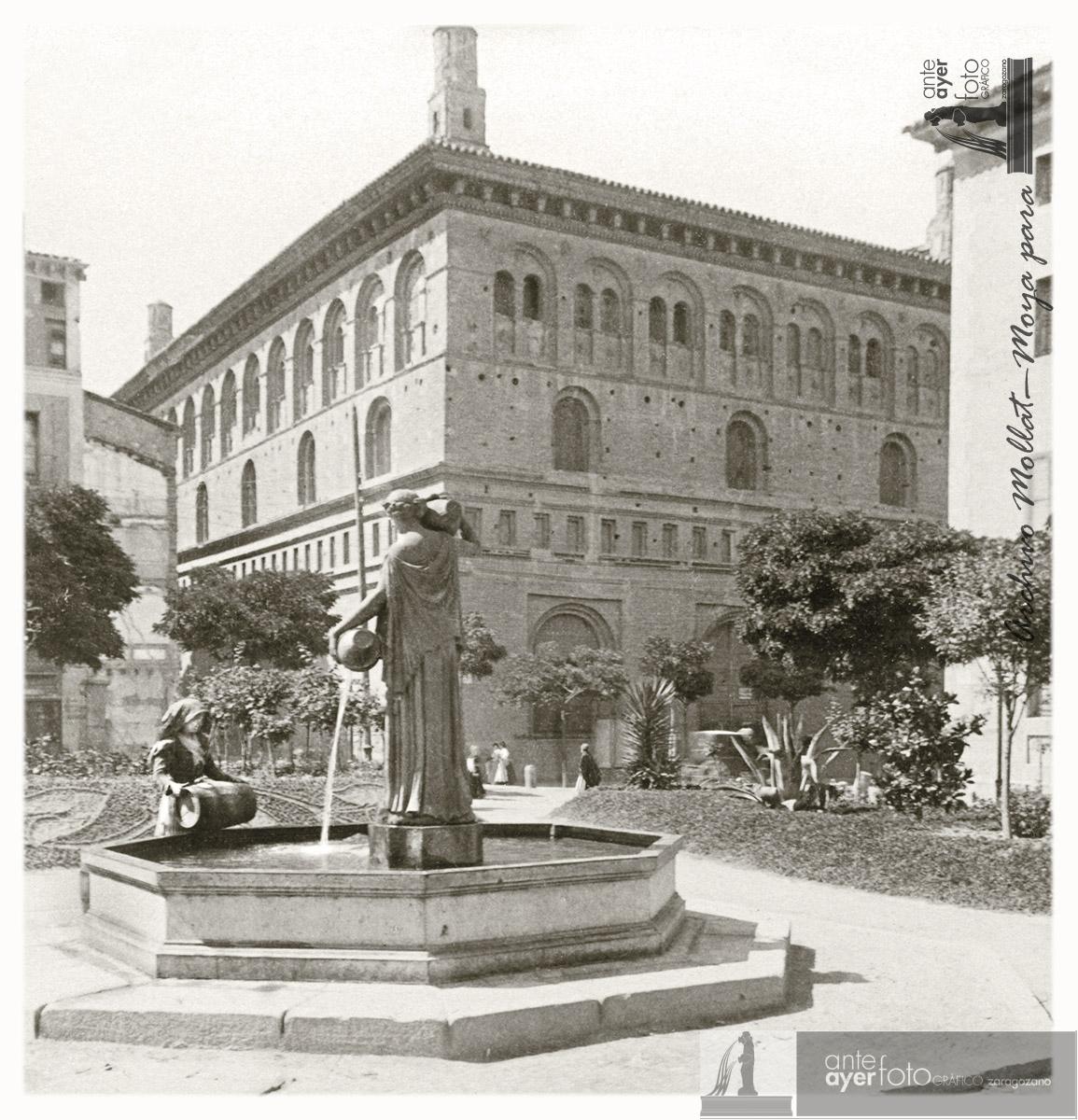 La Lonja y la plaza de la Seo, con la fuente de la Samaritana. Underwood & Underwood.
