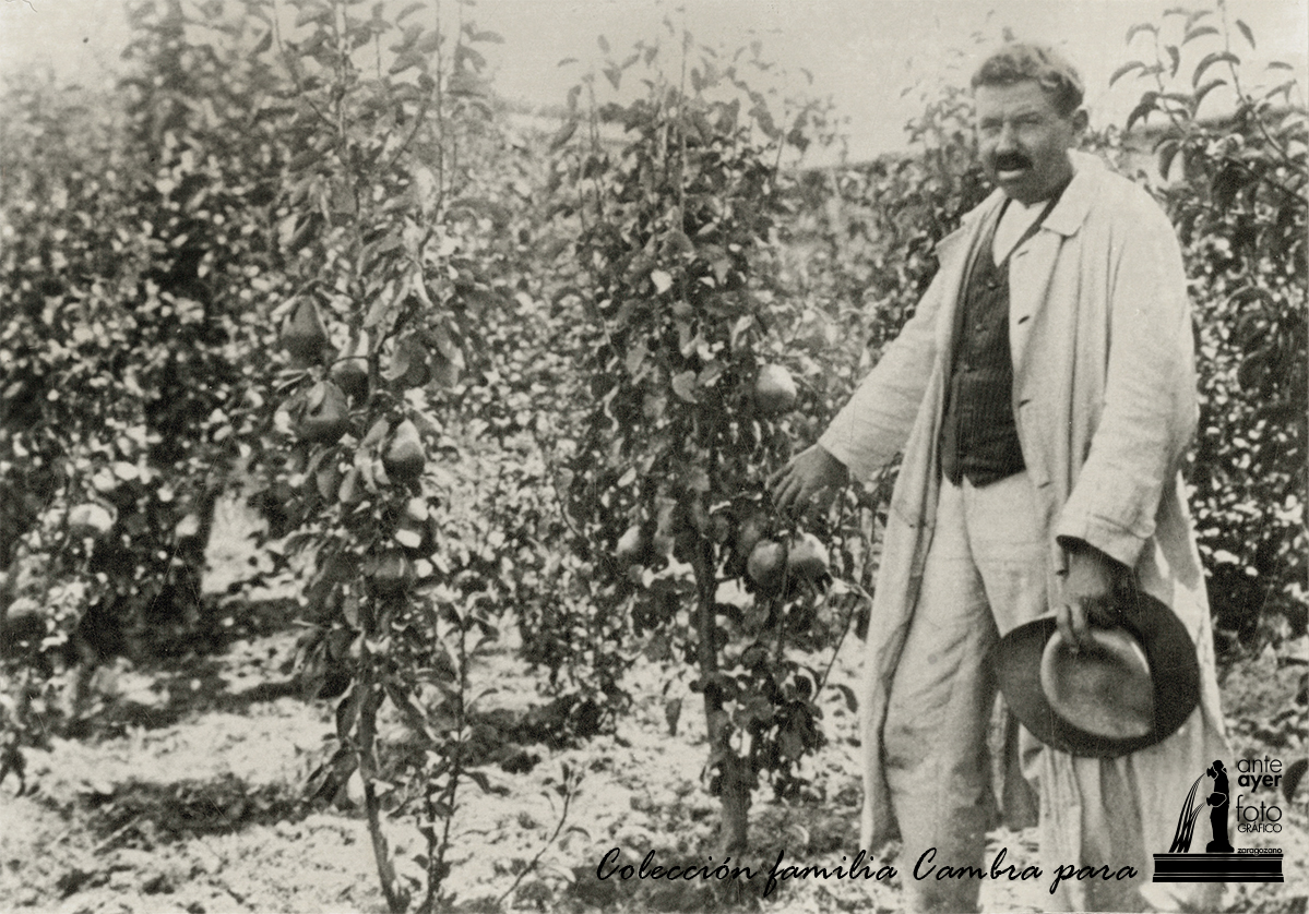 Mariano Cambra Ferrer en la torre de Las Fuentes posa con su colección de plantas madres de variedades de peral. 1914.