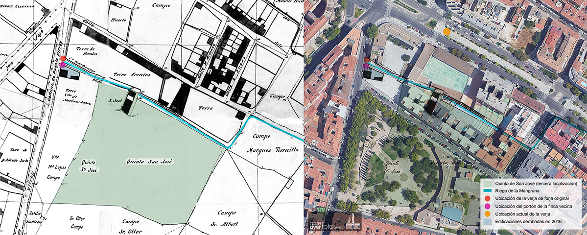 Señalización realizada por L. Fran Ríos de la tercera Quinta de San José ubicada en el camino del Puente del Virrey nº 9, accesible a través de una pequeña senda particular por donde circulaba el riego o acequia de la Mangrana del que se abastecían. Plano 1910-1920 y comparativa actual para Anteayer Fotográfico Zaragozano