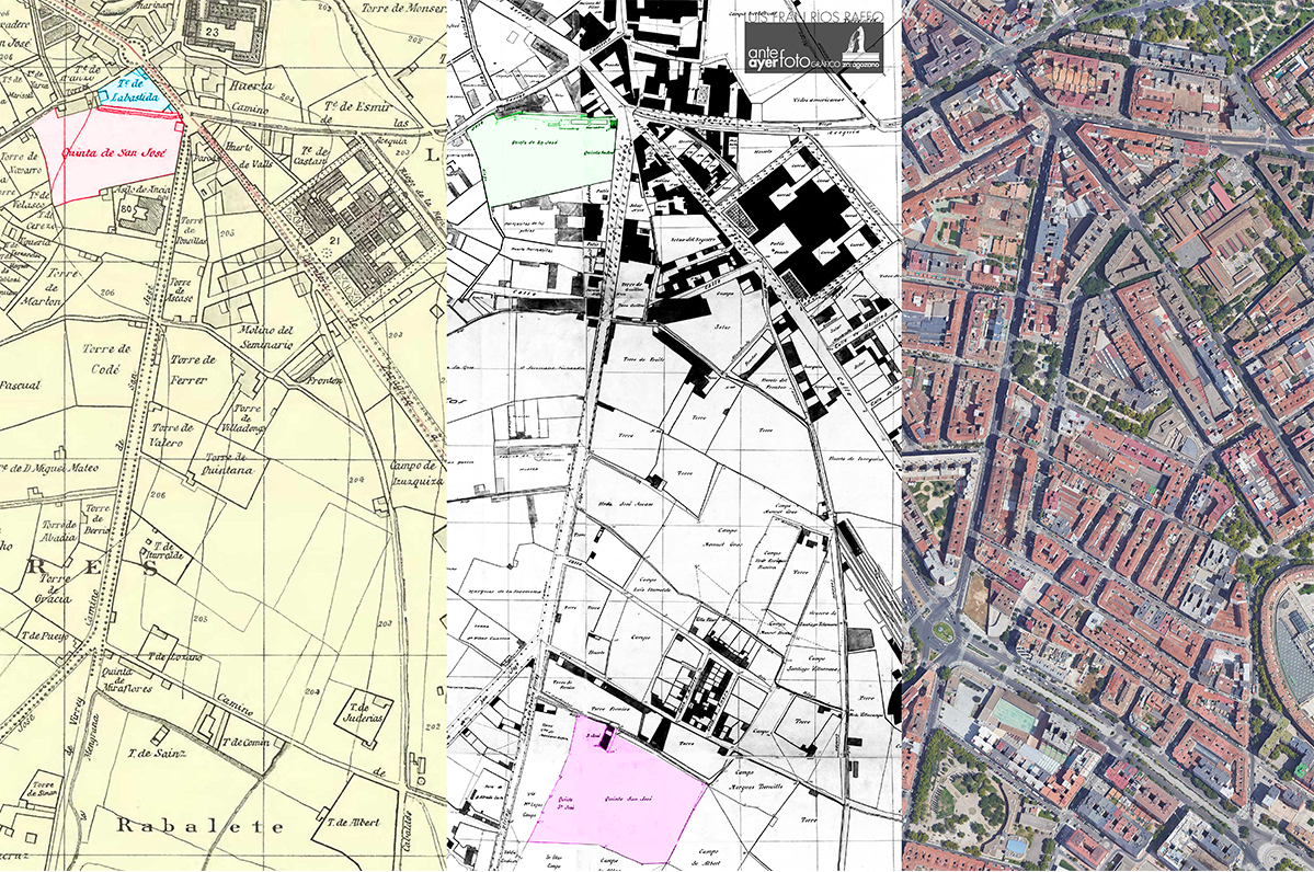 Comparativa realizada por L. Fran Ríos del plano de Casañal de 1899, el de 1915 y vista actual. Enmarcadas en azul, la 1ª Quinta de San José (1877) ubicada en la antigua Torre de Sesma, luego de Labastida. En rojo y verde la 2ª Quinta de San José (1885) ambas junto al penal de San José en Montemolín 191 y 193 respectivamente. En lila la 3º Quinta de San José en el camino del Puente Virrey nº 9. AMZ y Google Maps