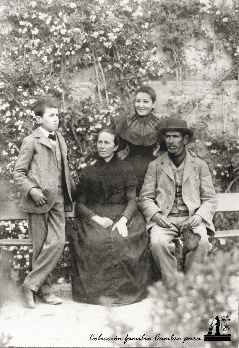 Mariano Cambra Lisón y su hijo Mariano Cambra Ferrer en la entrada de la segunda Quinta de San José en Montemolín nº 193 bajo un emparrado que la cubrió en la primera época. A la derecha, Isidora Ferrer y unas señoras. Ca. 1892.
