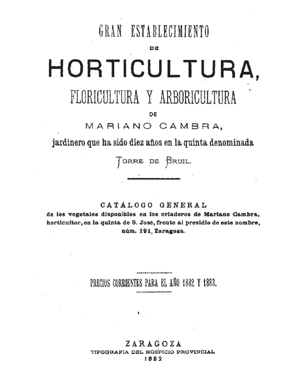 Portada del primer catálogo editado por Mariano Cambra Lisón tras establecerse por su cuenta en la 1ª Quinta de San José. 1882.