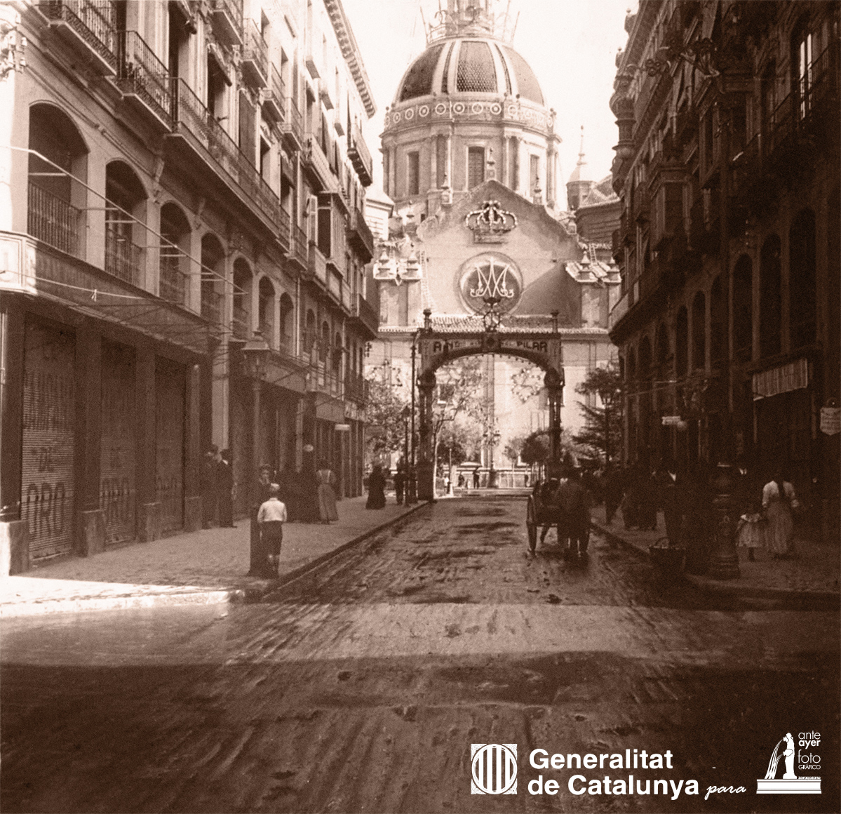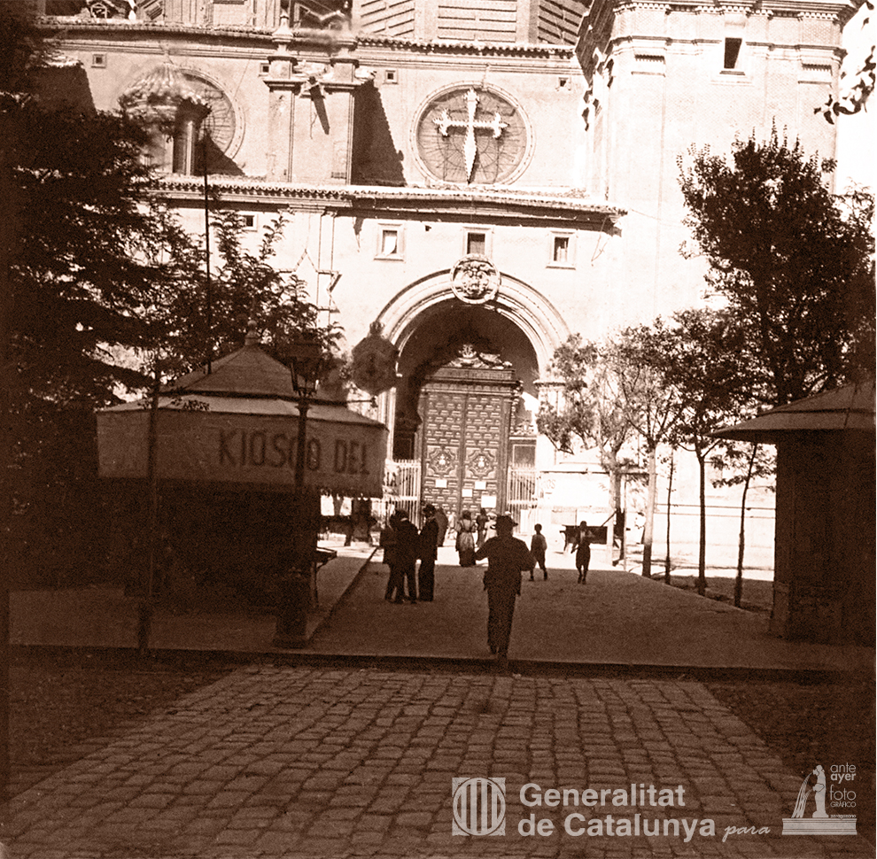 No sabemos si Llorenç realizó la fotografía de la plaza del Pilar antes o después de subir a la torre, lo que sí adivinamos es su interés por retratar luces y sombras, perspectivas diferentes a las acostumbradas por otros fotógrafos de la época, mostrándonos unos encuadres novedosos a pesar de su juventud. El camino adoquinado que conduce al templo junto al Kiosco de venta de recuerdos y medallas del Pilar de Ignacio Aguilar llamado Platero de las dos catedrales, custodia la puerta baja en la que luce sobre una de las ventanas circulares la cruz de Santiago, pareja a la de San Jorge colocada en la puerta alta simbolizando las batallas de Clavijo y Alcoraz durante la reconquista. El fotógrafo también retrata una de las doce estrellas iluminadas que copaban la fachada y que iban de una puerta a otra simulando a las que adornaban la corona de la virgen. Por muy poco no podemos ver el medallón con el escudo de la ciudad colocado en la novísima torre de Nuestra Señora del Pilar, tapado por el arbolado existente. El otro medallón, el que representaba al Cabildo, se encontraba en la torre de Santiago.