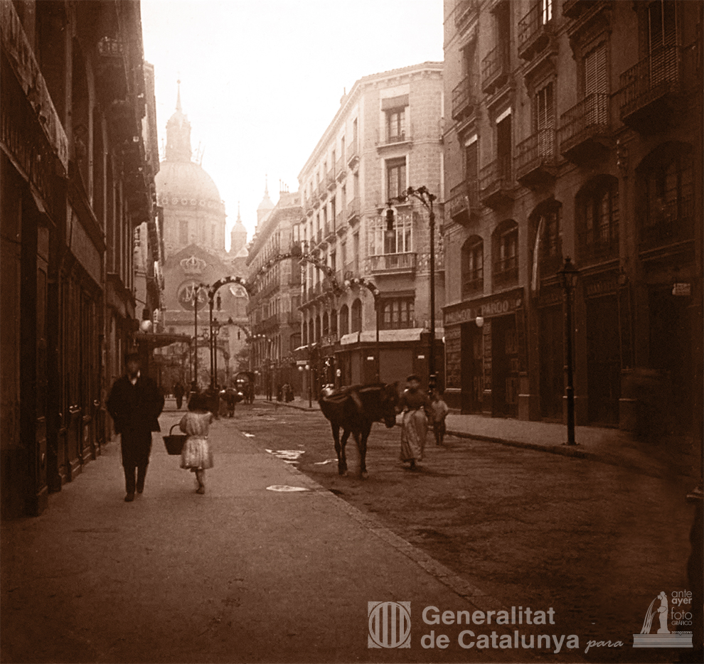 La familia Nonell Sarret también disfrutó de un bonito paseo por la calle más señorial de Zaragoza, la calle de Alfonso I con sus distinguidos comercios como La Campana de Oro en el número 41 desde 1892, concesionaria de las máquinas de coser Singer o la de paños de Muñoz y Pardo, sucesores de Anechina en el 28-30. El arco efímero dedicado a Ntra. Sra. del Pilar enmarca la entrada a la plaza, y con ella, al fondo emerge la iluminación del Anagrama de la Virgen y sobre ella, la corona real borbónica. También deslumbran otras tantas estrellas antes mencionadas y el detalle de varias escaleras encastradas aún en la fachada como muestra del montaje de la casa Kribben de Barcelona, bajo proyecto del zaragozano José Nasarre. El suelo todavía húmedo tras las últimas lluvias embellece incluso más una calle Alfonso decorada con coquetos arcos voltaicos, testigos ilustres por los que transita el costumbrismo más arraigado y la devoción a una virgen. Tradición y modernidad parecían estar destinadas a entenderse. El verdadero siglo de las luces, aunque tarde, había llegado para quedarse.