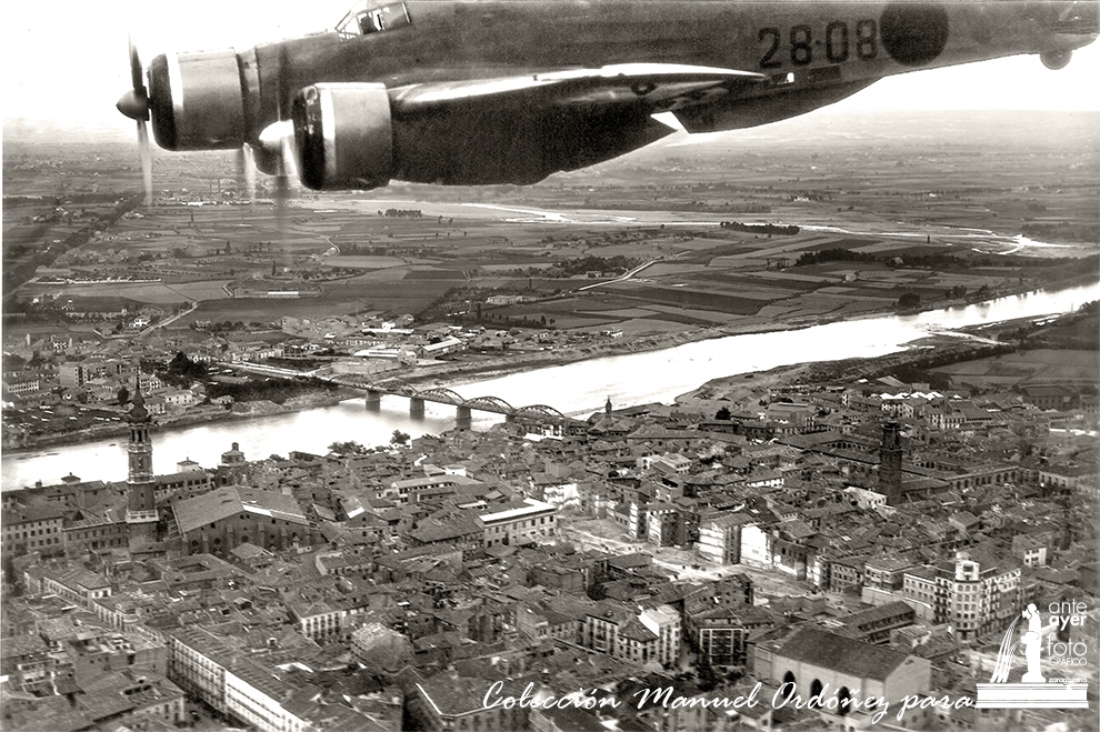Un Savoia Marchetti S-79 sobrevuela Zaragoza. Destaca la cicatriz abierta en el caserío del Casco Antiguo por la demolición de 150 edificios, 1938. Aviación legionaria italiana.