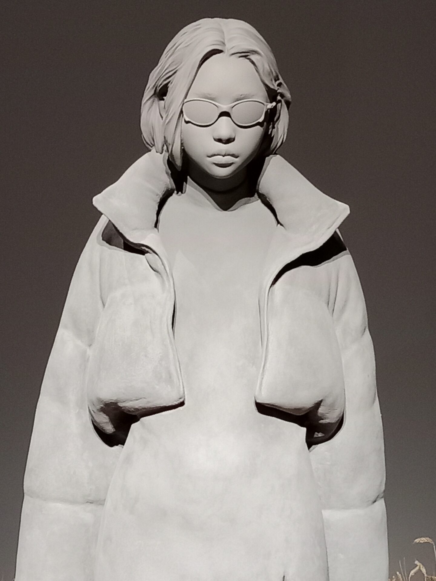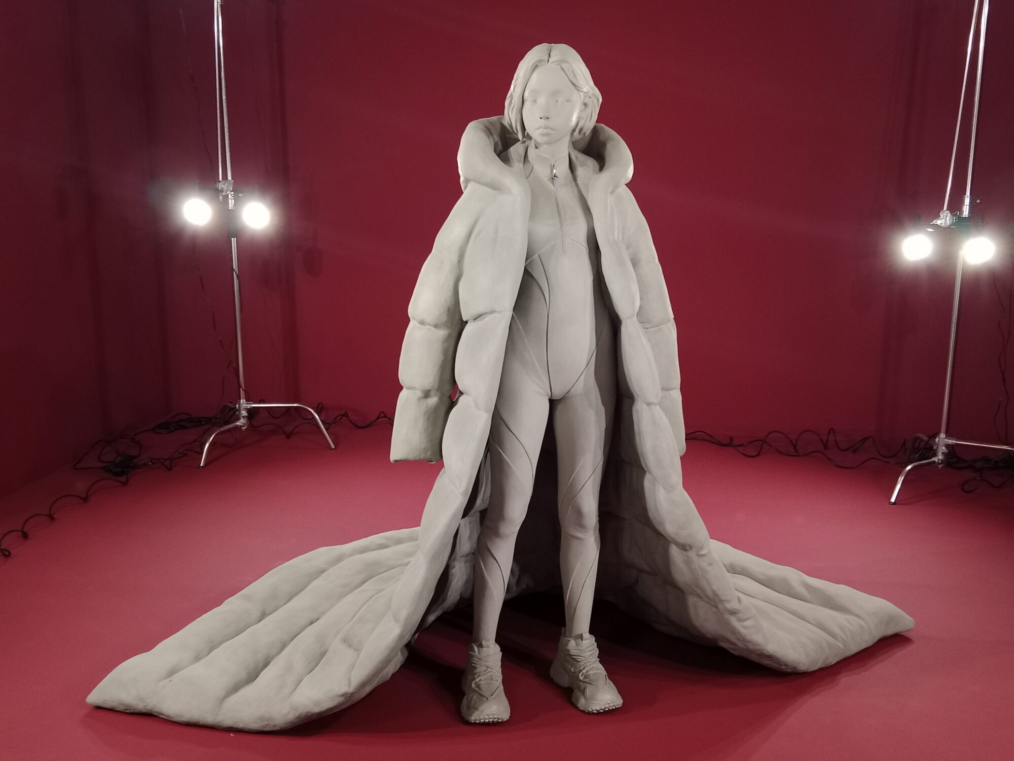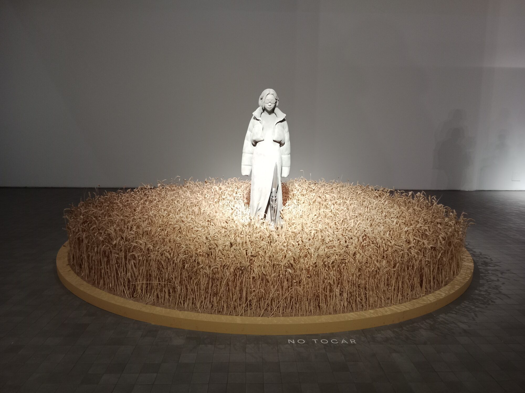 La naturaleza que bordea a la pieza TRASHUMAN 03 en amarillo pajizo surge de los campos que un día nos dieron de comer y que hoy envuelve a la escultura como un fuego fatuo recordándonos que es imposible escapar de la llamarada del supuesto progreso. Los materiales empleados como cemento, resina y fibra de vidrio, entre otros, son moldeados con maestría creando cuerpos inertes que se protegen del exterior con prendas de abrigo largos y cortos, acolchados y mullidos reinterpretando el calor terrenal perdido. Prendas que ocultan las manos, que permanecen abiertas en monos entallados o sobre un largo vestido con abertura frontal que muestra extremidades mimetizadas, robotizadas…